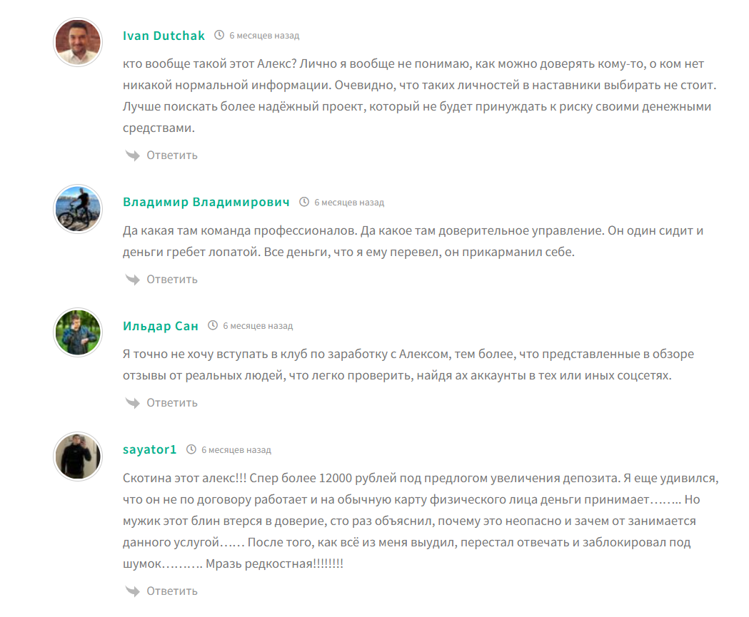 Примечание! Данная личность с фото и роликов нам весьма знакома, у него еще есть канал «Торговля с Алексом | Инвест пулы». Наша команда уже делала обзор о нем, вот ссылка, кстати, отклики под статьей исключительно отрицательные.
