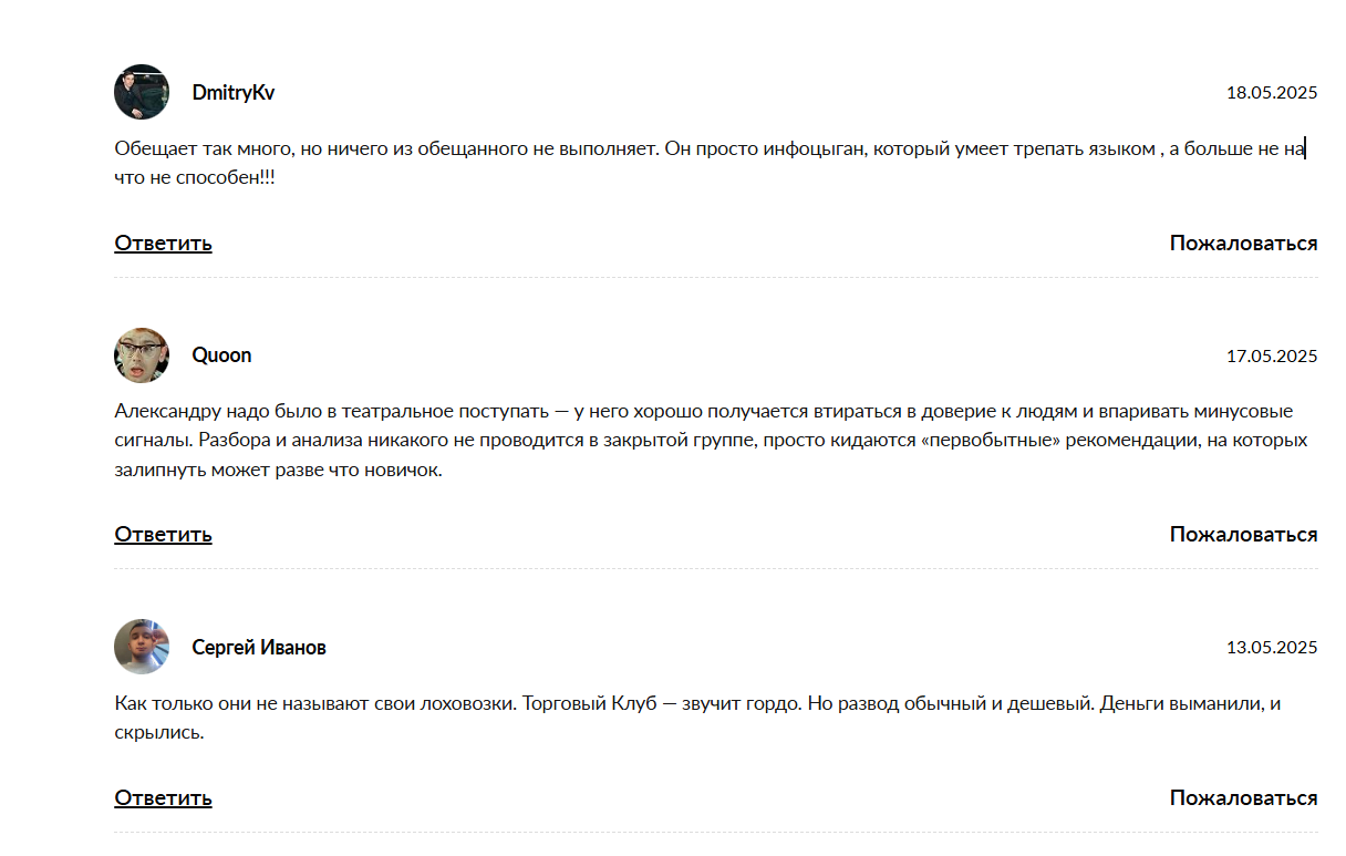 На самом канале Работа с Алексом @alex_pro_community на постоянной основе выкладываются переписки и видеоотзывы, где нашего гуру трейдера благодарят за честность, своевременные выплаты и помощь в тяжелом финансовом положении. На тематических сайтах история совсем другая, везде (в том числе и на нашем верификаторе) сплошные обвинения в разводе. В статьях рассказывают, что это мошенник, а в жалобах люди делятся, кто и сколько потерял: