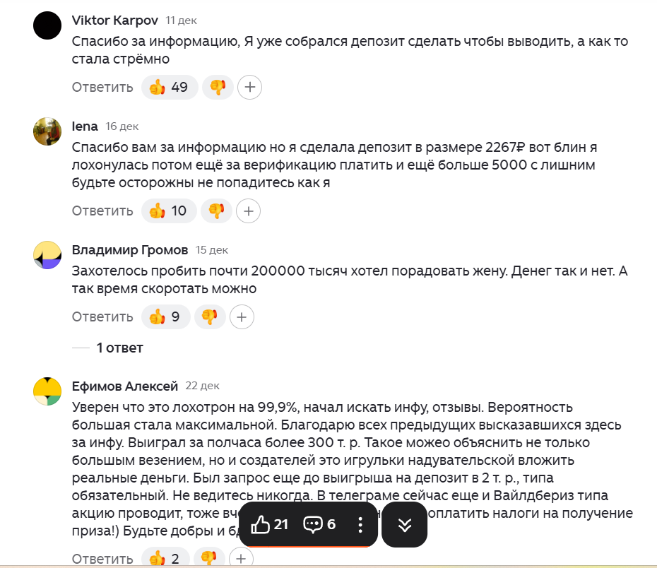 Схема развода ничем не отличается от раскруток депозитов на крипте и розыгрышей с денежными призами. Набить минимальную сумму на вывод (10000 рублей) несложно, а вот вывести невозможно. При оформлении выплаты попросят вначале внести депозит, после появится необходимость в прохождении платной верификации. Выдуманные поводы могут поступать бесконечно. Обязательно появятся налоги на выигрыш, комиссия и т.д. Вариант, где игрок получает деньги, изначально не предусмотрены. Некоторые самые доверчивые потеряли более 20 тыс. рублей.