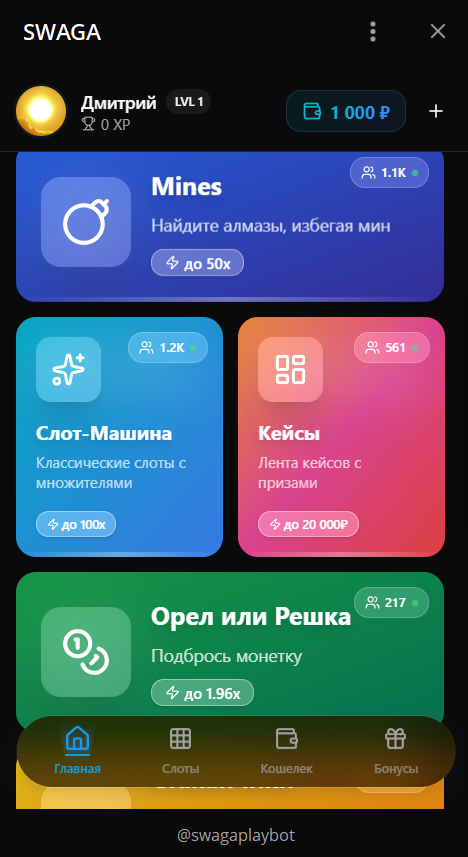 БОТ СВАГА в ТГ предлагает подписчикам быстрые игры, моментальные выплаты и бездепозитные бонусы (1000 рублей). После нажатия старта появляется возможность открыть приложение: