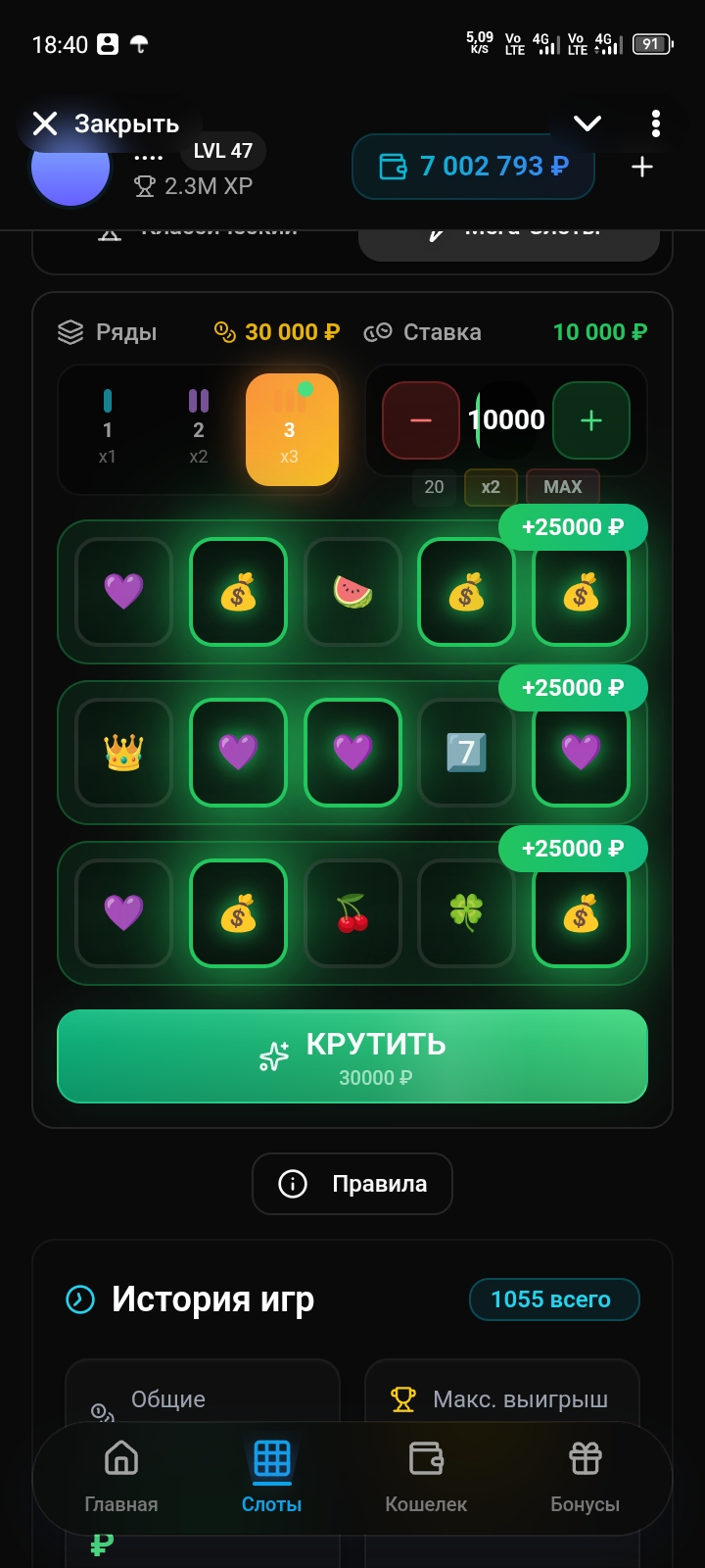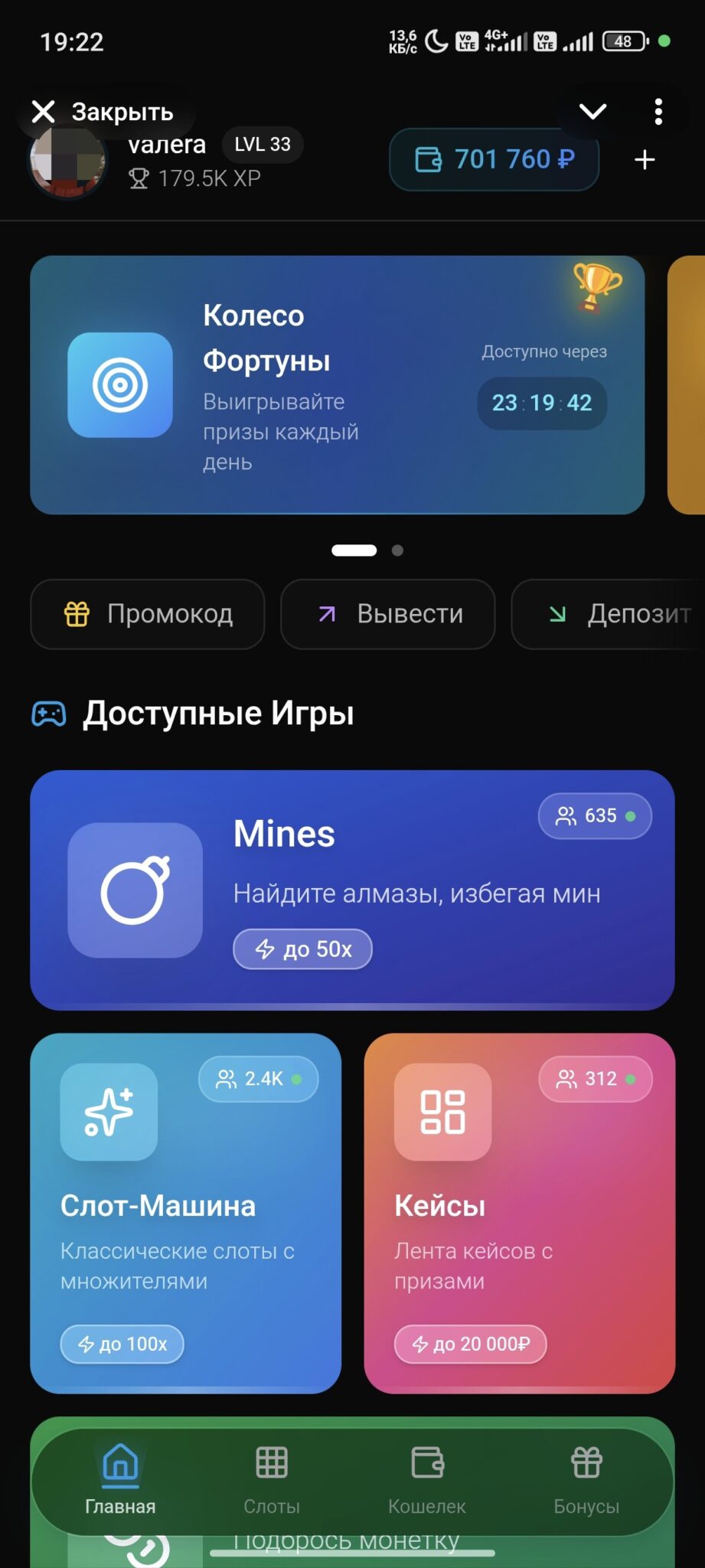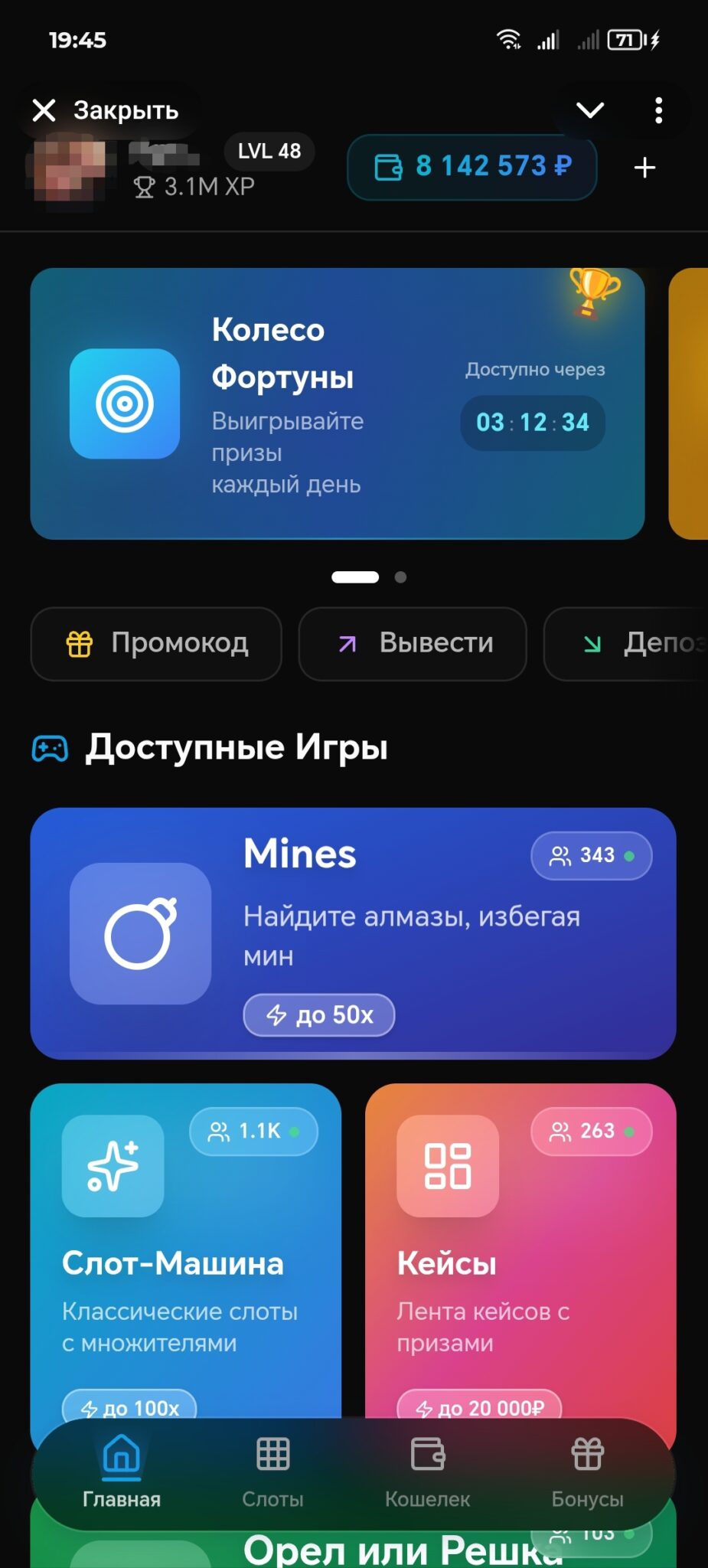 Для игры доступно: «Mines» (поиск алмазов в обход мин), «Слот-Машина» (классические слоты с множителями), «Кейсы» (лента кейсов с призами), «Орел и решка» (угадывание стороны монетки), «Стаканчики» (поиск шарика).