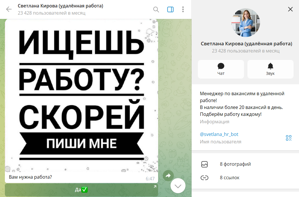 Обычно на таких каналах и в ботах, как Светлана Кирова (удаленная работа), активно рекламируются мошенники, которые разводят по распространенным схемам. Людям предлагают вкладывать денежные средства не несколько часов под 100000%. Выплат, конечно, нет. После первого депозита просят второй, потом третий и так далее.