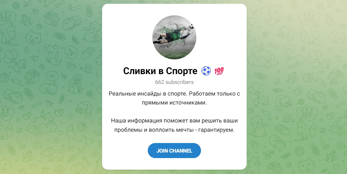 Основание датируется 16 июля 2022, первый пост выложен только 4 марта 2023, а на постоянной основе публикации в ленте стали появляться только летом 2024. По сути, этому каналу в телеграме всего несколько месяцев. В сообществе 660 подписчиков, новых подписчиков привлекают спамом из групп ВК – в комментариях различные люди пишут, что есть человек со 100% спортивными прогнозами. Общаться возможность закрыта.