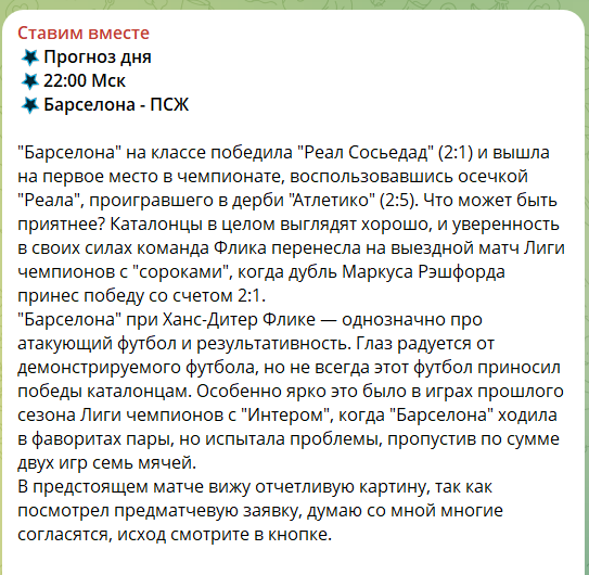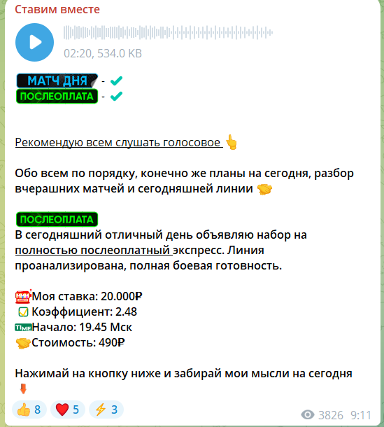 На канале ТГ Ставим вместе при публикации прогноза каппер Виктор Пчелинцев дает краткое обоснование и разбор по предстоящей игре. Пари заключают на основные (победы, форы и т.д.) и второстепенные (индивидуальная результативность и т.д.) исходы в букмекерской конторе. Коэффициенты на спортивные события средние: