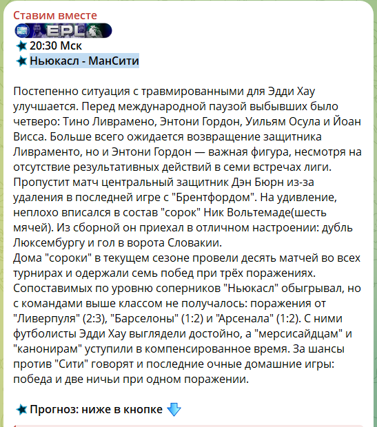 Тот редкий случай, когда подписчиков обманывают даже не бесплатных прогнозов. Для примера разберем совет каппера на матч Ньюкасл и МанСити (английская премьер-лига), который пройдет 22 ноября 2025 в 20:30 по МСК:
