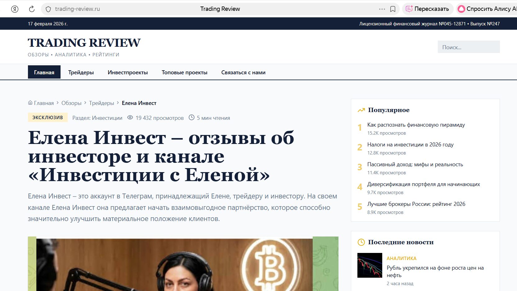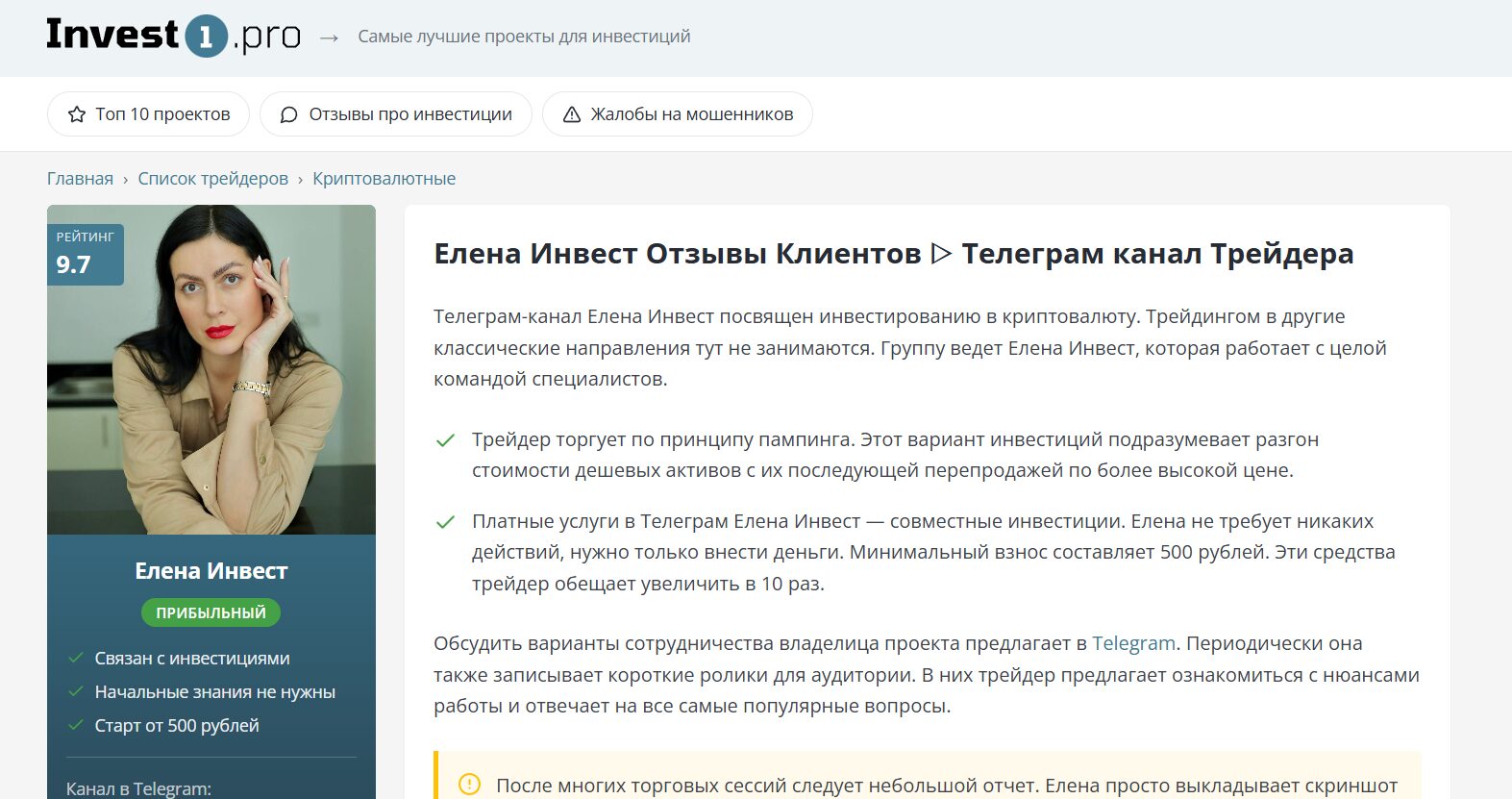 Основательница Елена заявляет, что это финансовый проект для помощи гражданам РФ. Девушка не скрывает лица и себе говорит, что работает на рынке более 5 лет, а в общем списке более 10000 довольных клиентов. По легенде является лидером в своем сегменте. Трейдер работает на бирже, но проверить результаты нельзя, так как торговые сигналы и статистика не предусмотрены.