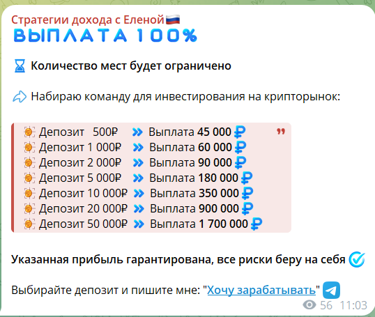 Обычно на канале ТГ Стратегия дохода с Еленой в день проводят по две торговые сессии, о которых аудиторию оповещают заранее. По вкладам предложена весьма высокая процентная ставка (3400-4500%) всего за несколько часов: