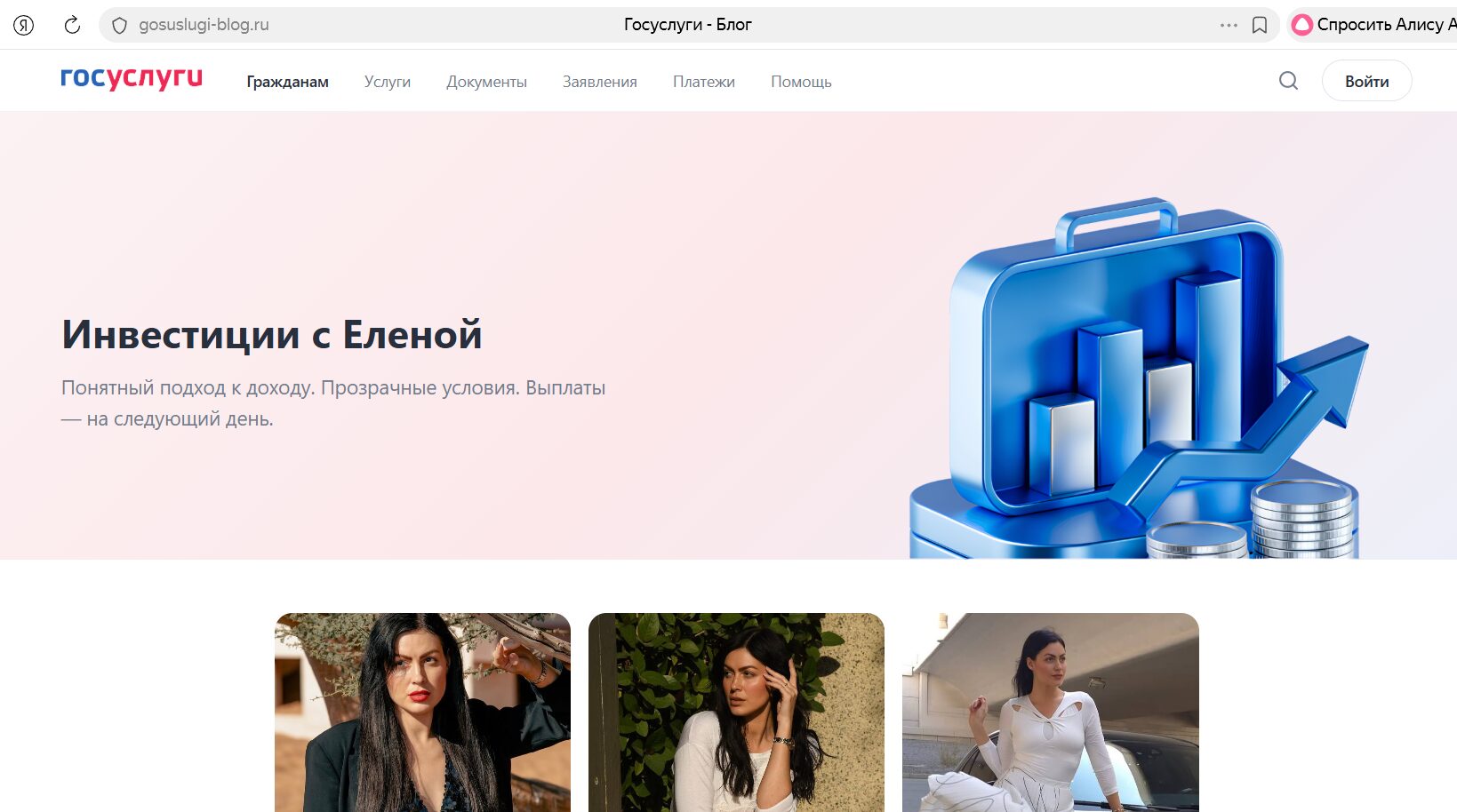 Важно знать, что всем нагло лгут. Это сайты одностранички с измененным доменным именем. То есть, ни сбер, ни госуслуги, ни даже обычные сервисы по проверке к этой особе не имеют никакого отношения. Если нажать на любую категорию на сайте, то страничка даже не изменится. Такой подход обычно срабатывает на неопытных и невнимательных людях…