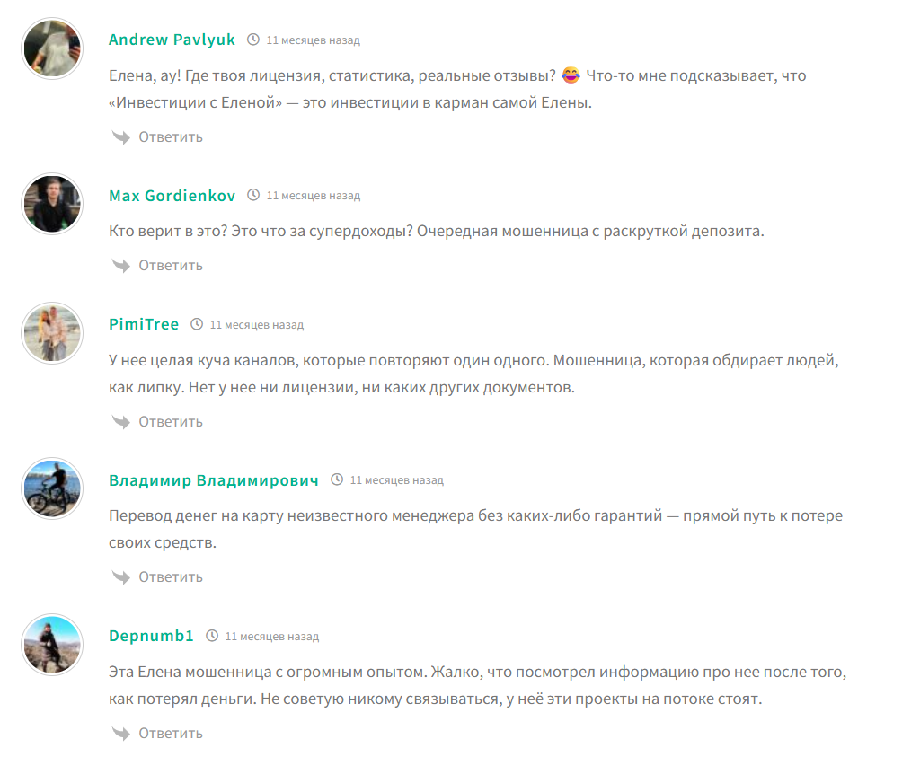 После удачной торговой сессии в ленте появляются диалоги и даже видеоотзывы от инвесторов, которые прибывают в восторге от полученной прибыли. Подобные фейковые видео комментарии покупаются, а переписки делаются вручную. Объективные данные о сомнительном сервисе можно найти на независимых сайтах, где нашего гуру трейдинга называют мошенницей. На сегодня деньги потеряли десятки доверчивых людей, вот только несколько примеров с жалобами: