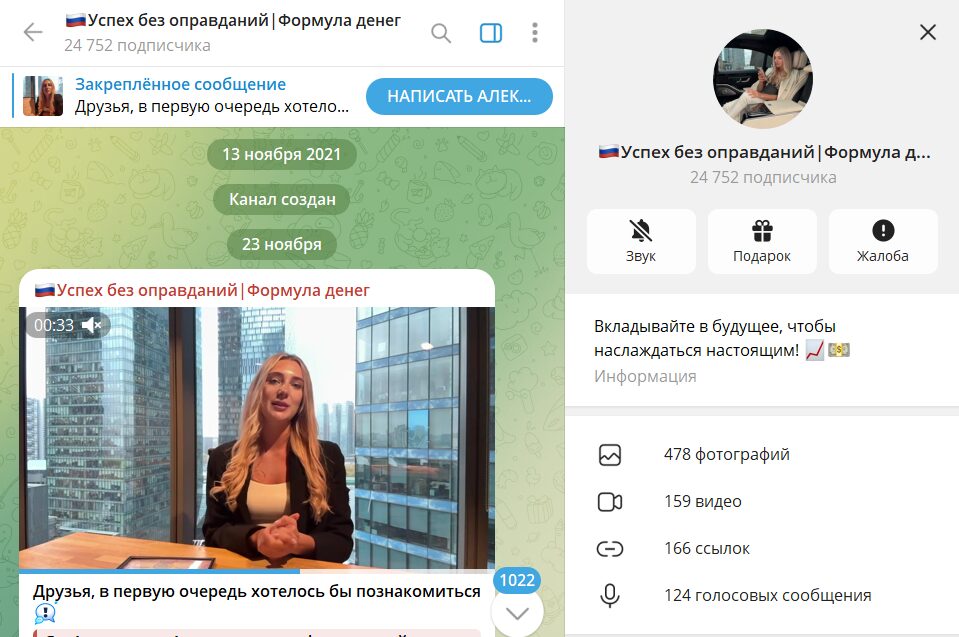 Успех без оправданий | Формула денег – это телеграмм-канал с услугами по увеличению депозитов на финансовых рынках. В роли инвестора и трейдера выступает Александра Александровна. После проведенного анализа проект отправляется в черный список, так как выплаты по вкладам не предусмотрены изначально. Схема обмана предполагает несколько ступеней, итог всегда один – блокировка и удаление переписки.