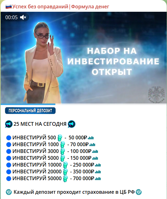 Инвестор Александра Александровна особый акцент делается на переписки и видео отзывы от довольных вкладчиков. Клиенты подтверждают факт получения денег по инвестициям. Заявленная оценка не представляет никакой ценности. Команда KAPER.PRO изучила тематические сайты. Обзоры и отклики пока не появились, но, во-первых, канал молодой (всего месяц), во-вторых, часто меняются названия.