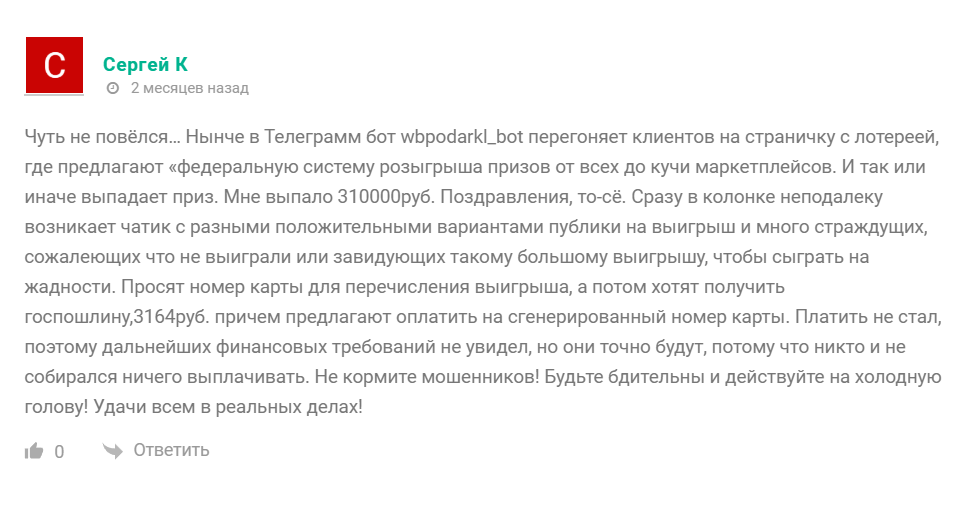 В самом приложении нет комментариев от победителей. При серфинге тематических порталов и форумов найти никакой информации не удалось, так как сомнительный проект развиваться стал относительно недавно. Причем на нашем сайте есть обзор на подобный бот «Гарантированные подарки РФ». Под статьей молодой человек подробно рассказывает о схеме обмана. Он выиграл более 300 тыс. рублей, но для возможности выплаты с него попросили оплатить госпошлину в размере 3 тыс. рублей: