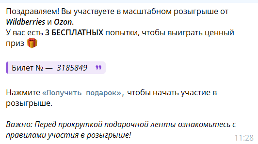 Федеральная Раздача Призов — только в Telegram Официальный бот розыгрыша от Wildberries и Ozon — крупнейших онлайн-площадок России. Главный приз составляет 1 миллион рублей, в процессе уже выплачено 13 млн. руб. Данный проект рекомендуют ТОПовые блогеры, за счет чего можно быть уверенным в честности. Помимо ценных подарков можно еще получить промокоды на покупки.