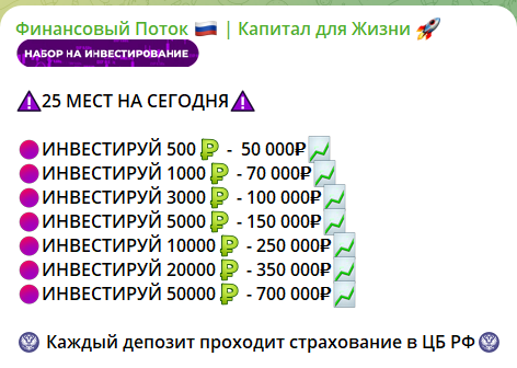 Инвестор Валерия с телеграм-канала Финансовый поток | Капитал для жизни предлагает нереальные условия по вкладам. Буквально за несколько часов можно приумножить свой капитал в 100 раз: