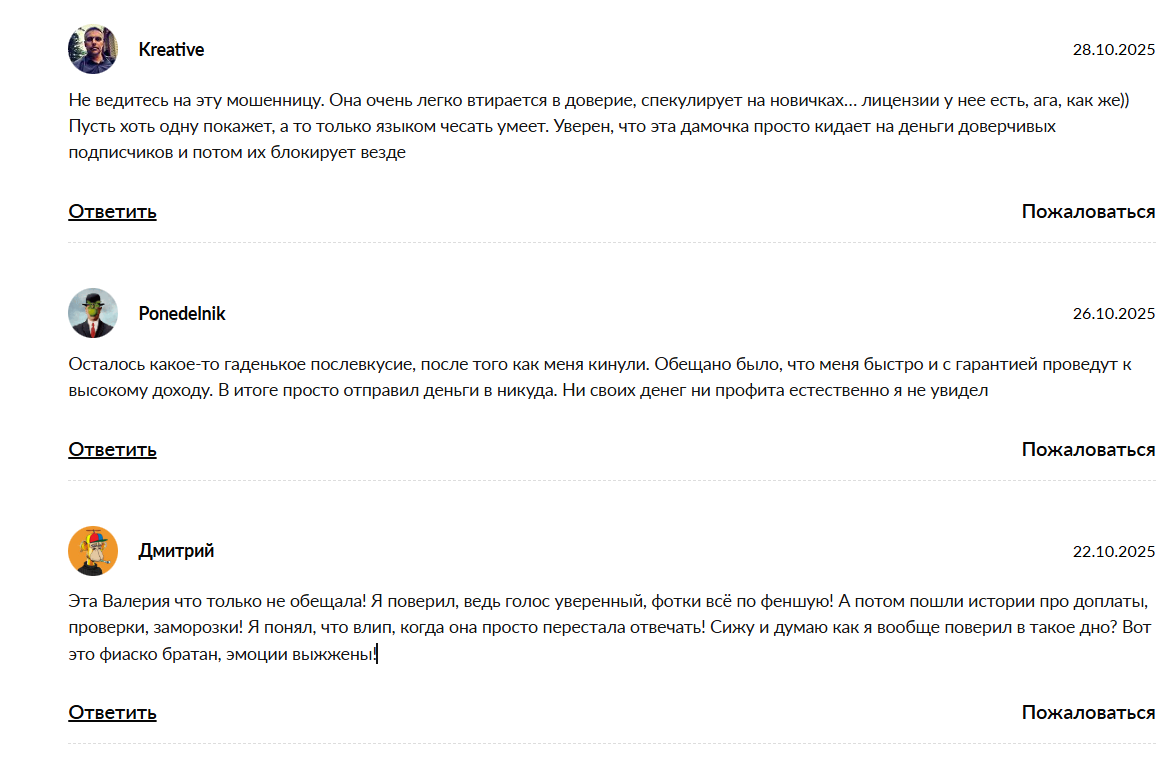 Трейдер и инвестор Валерия свою честность доказывает переписками (диалогами) и видеоотзывами, которые якобы оставляют вкладчики после получения выплаты. Подобные комментарии на 100% фейк, объективная информация на тематических сайтах. Крипто сервис везде добавлен в черный список, а под опубликованными обзорами в 90% случаев оставлены жалобы (хороших отзывов нет):