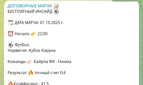 Легенда о заработках без рисков в букмекерской конторе на договорных матчах не более чем миф, который активно распространяют мошенники. Верят обычно новички, причем в этом направлении используются различные схемы развода. Сегодня рассмотрим матч между футбольными клубами Кайрла ФК и Ниима Норвеги. Кубок Кируна. По легенде о результате известно заранее, но так ли это на самом деле???