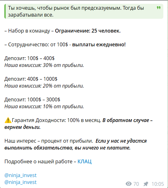 Большинство неопытных игроков рынка (подписчиков) ведутся на такие предложения, ведь буквально за месяц можно приумножить свой капитал на +100%. Итог всегда плачевен, да, разовая выплата возможна, но только в надежде, что человек внесет более крупные суммы, но если платежа не будет, больше ничего не выплатят. И в любом случае получить более крупную сумму, чем вложил, точно не получится.