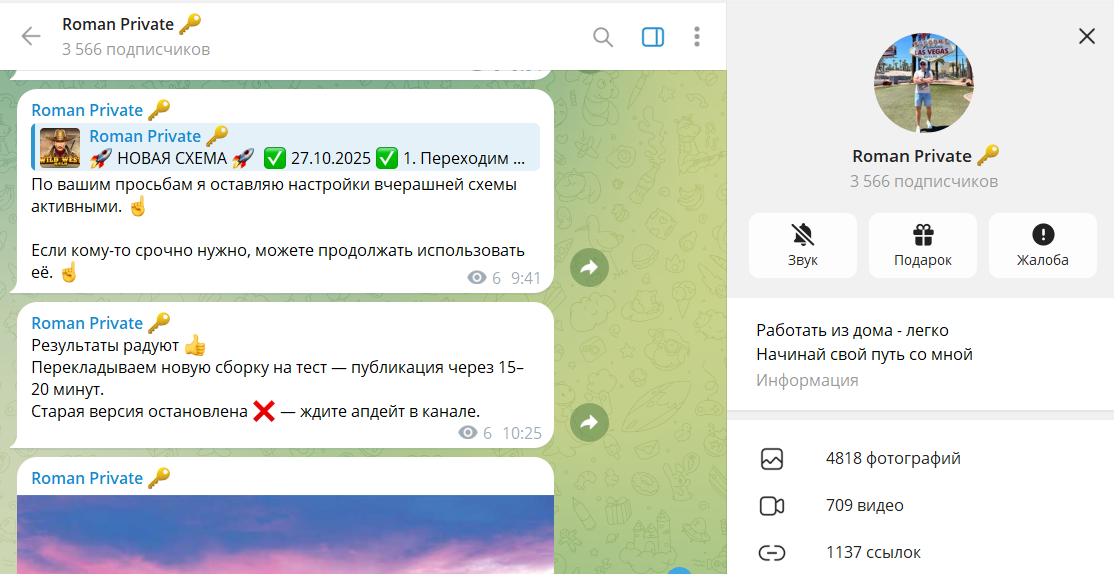 Проект Roman Private посвящен гарантированным заработкам в интернет казино. Автор канала в телеграмме уверяет, что обладает уникальными инструкциями по выигрышу. Свою честность подтверждает видеороликами с платформы и переписками (отзывами) подписчиков. Проверка показала, что это очередной мошенник, который ведет несколько групп с разными названиями. Да, выиграть удастся, но получить деньги обратно, нет, причем всех будут пробовать обмануть несколько раз.