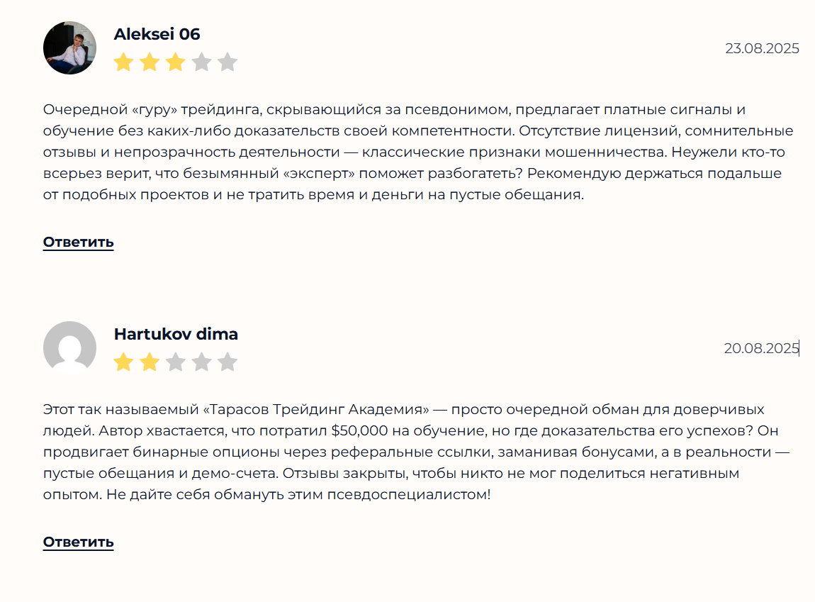 У себя в сообществе Илья Тарасов (tarasov_finance) демонстрирует только хорошие отзывы от якобы клиентов, подключенных к копитрейдингу. На подобные комментарии обращать внимания не нужно. Более реальная информация о блоге представлена на тематических порталах и форумах, где этого гуру трейдера в обзорах и откликах открыто называют мошенником. Некоторые люди потеряли огромные суммы: