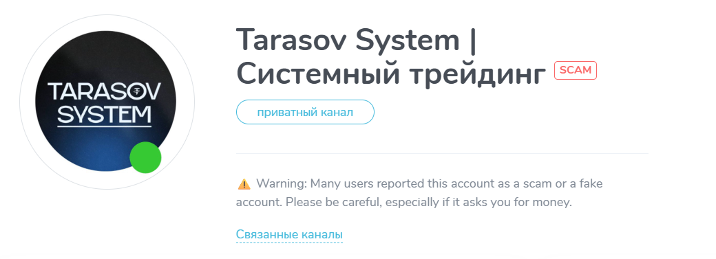 Tarasov System | Бизнес-трейдинг – это канал в телеграме с предложениями пассивных заработках на копитрейдинге криптовалют. В роли главного эксперта выступает Илья Тарасов (tarasov_finance), который работает вместе со своей командой. При анализе отмечено, что группа принадлежит мошеннику. На проекте аудиторию завлекают на СКАМ платформу, где вывод денежных средств невозможен. Наше мнение подтверждают негативные отзывы в интернете от кинутых пользователей.