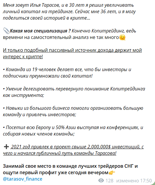 Создатель Илья Тарасов (@tarasov_finance) позиционирует себя успешным трейдером по криптовалютному рынку и обещает своим подписчикам космическую прибыль на копитрейдинге (автоматическом копировании сделок). О своем проекте автор рассказывает следующее: