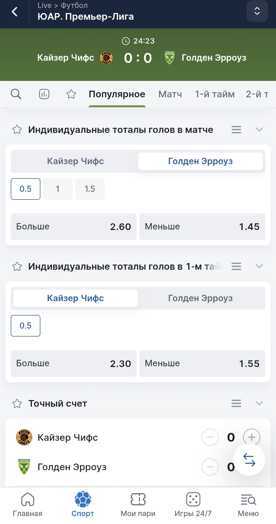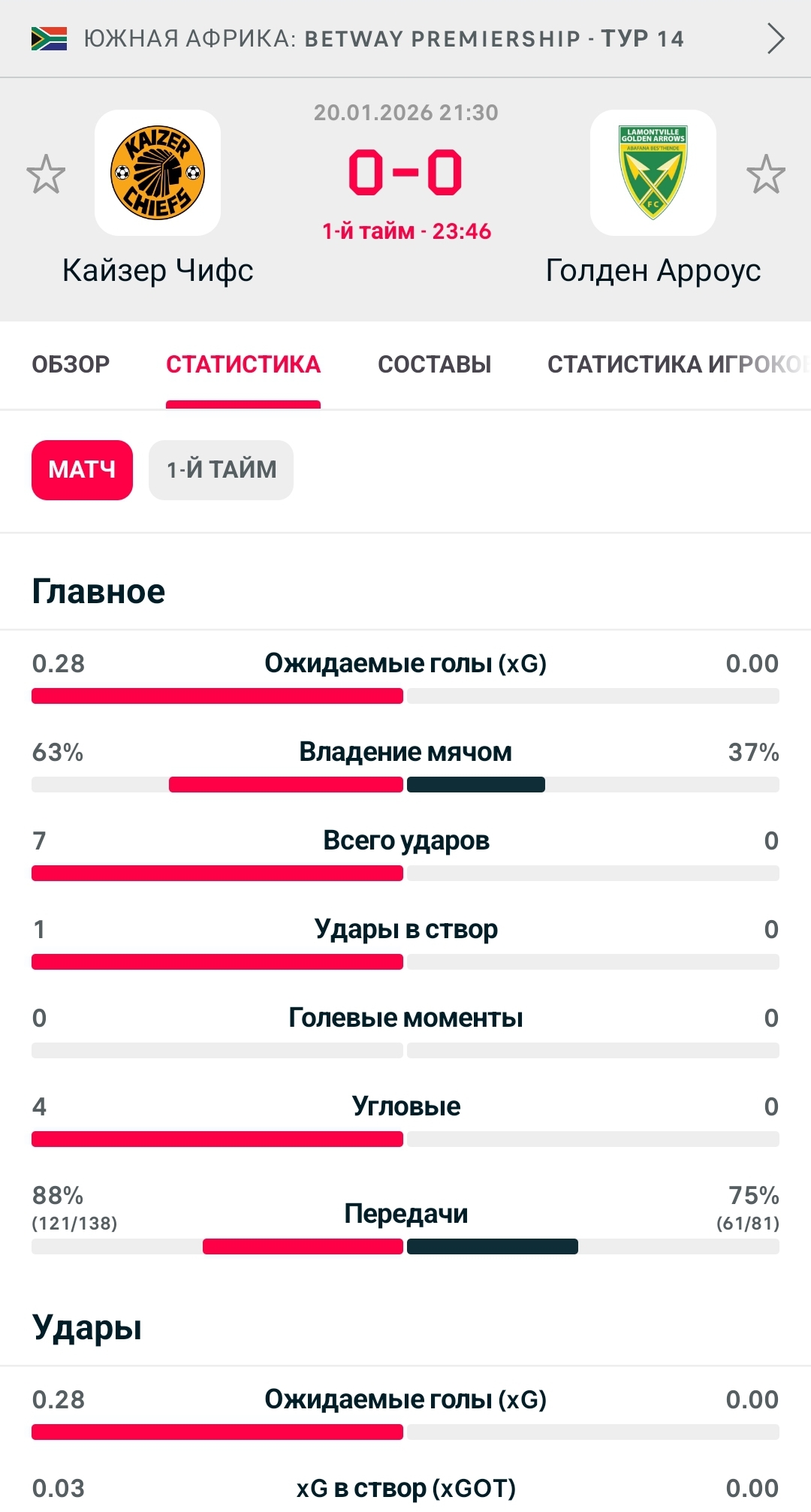 Матч Премьер-лиги ЮАР 20 января Кайзер Чифс – Голден Арроус. Коэффициент на победу хозяев в прематче предлагался в районе 1,48-1,50.