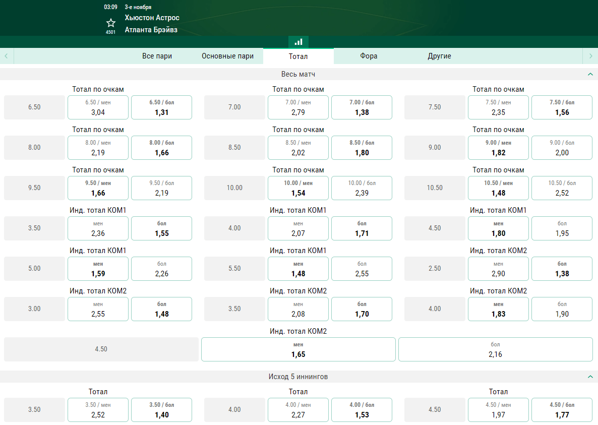 Правила размещения ставок на ТБ и ТМ на матчи MLB