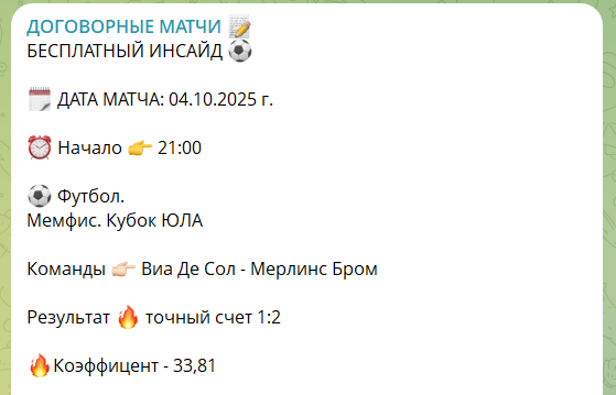 Новички в ставках на спорт прибывают в каком-то забвении и мечтают о миллионных выигрышах, чем активно пользуются мошенники. Сегодня будет освещена тема договорных (несуществующих) матчей, а именно между командами Виа Де Сол — Мерлинс Бром (Футбол. Мемфис. Кубок ЮЛА). На каналах и в группах предложено поставить на точный счет, гарантируя выигрыш. В данном случае псевдо инсайдеры прибегают в своем роде к уникальному способу обмана, когда подписчики несут двойные и даже тройные убытки, причем указанные игры действительно заходят.