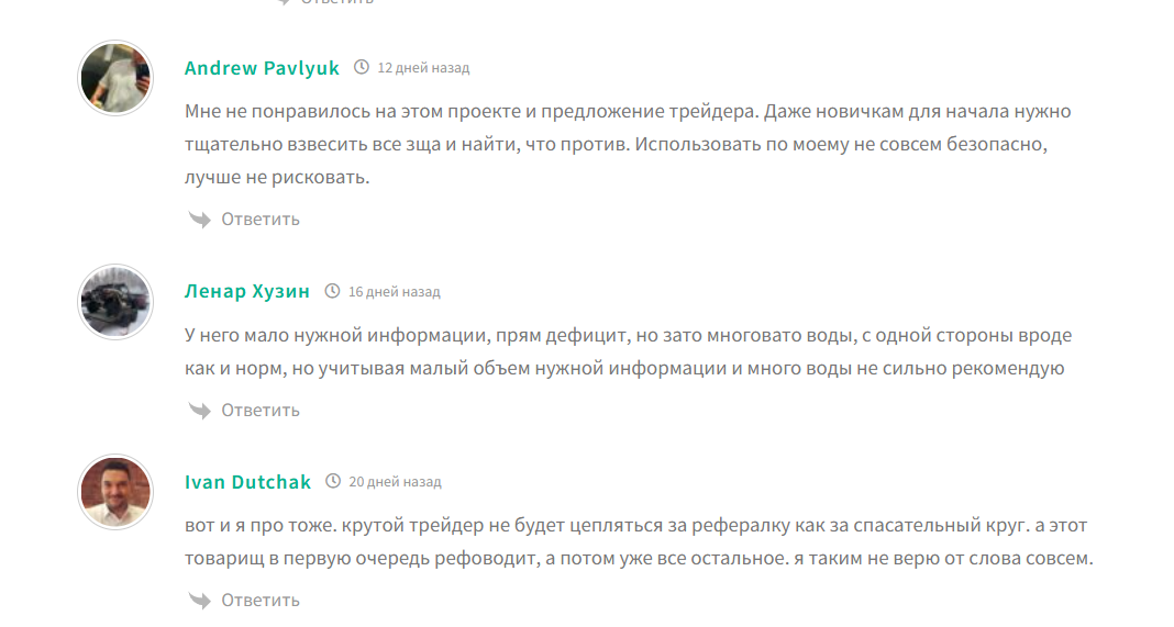 В основном и отдельном канале Roman @roman_phoenix демонстрирует переписки с клиентами, где также видны их сделки. Если судить по реакциям, все довольны, но вот если изучить тематические ресурсы, то мнение у пользователей совсем другое. Некоторые посетители сторонних сайтов нашего трейдера называют мошенником и разводилой: