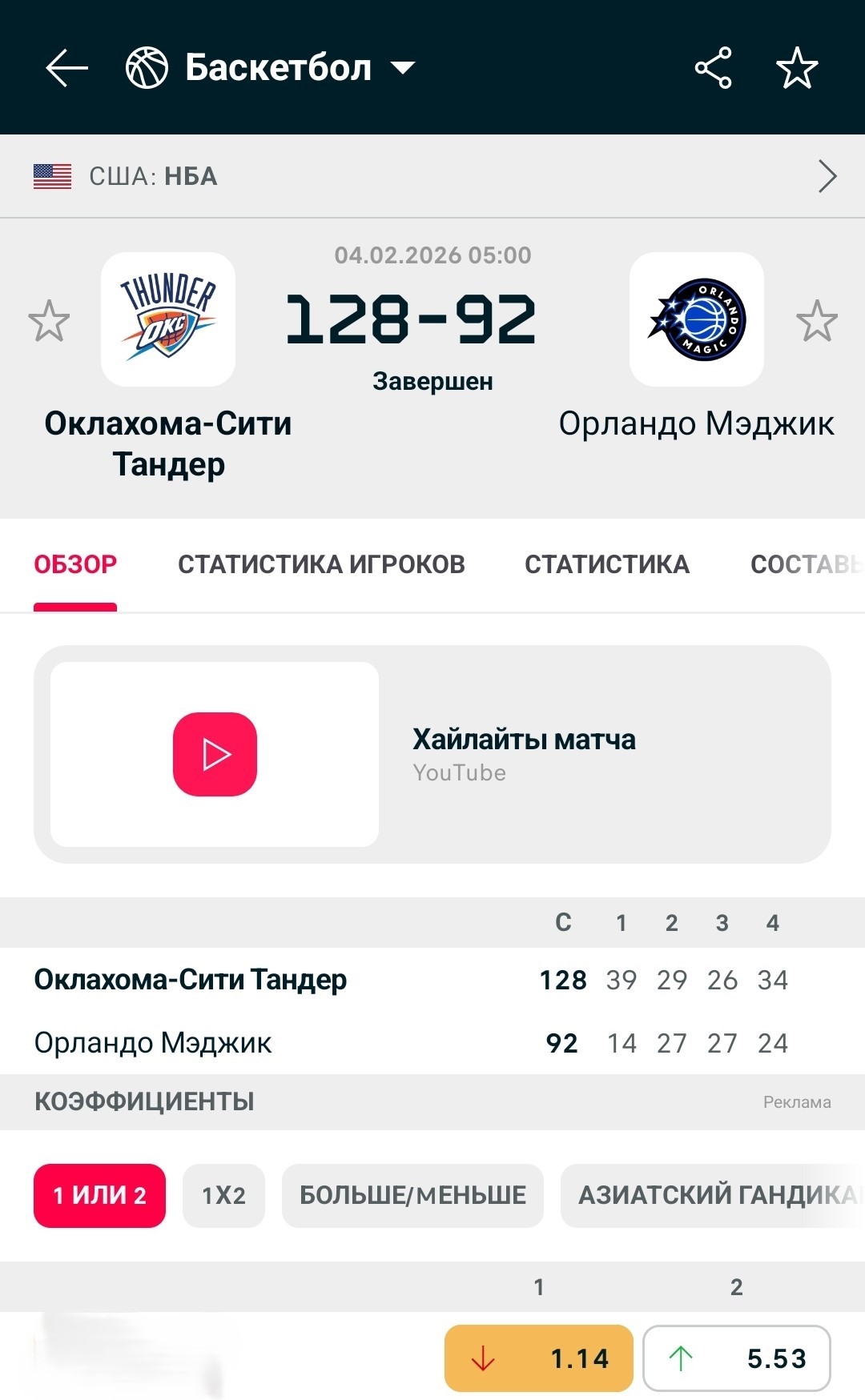 Пример ставок на тотал в четвертях баскетбольного матча: