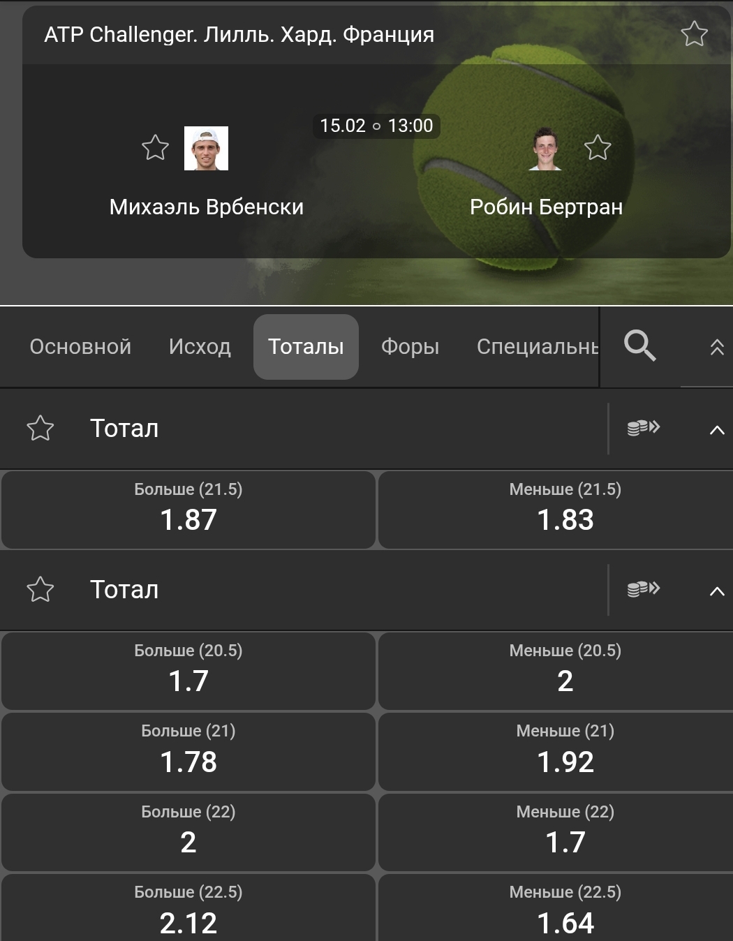 Например, в матче турнира в Лилле между Михаэлем Врбенски и Робином Бертраном можно заиграть ТБ 20,5 за 1,70 и ТМ 22,5 за 1,64. В коридоре два исхода – 21 и 22 гейма.