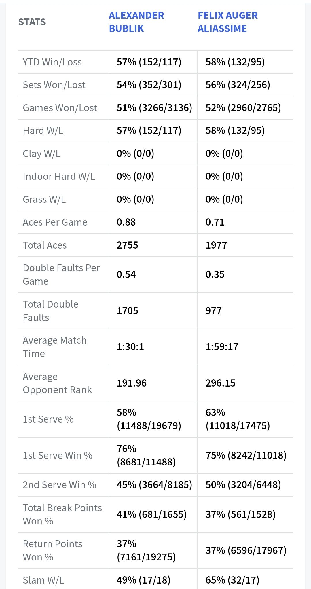 - Оба теннисиста имеют процент попадания первой подачей не менее 60, а выигрыша – 65;