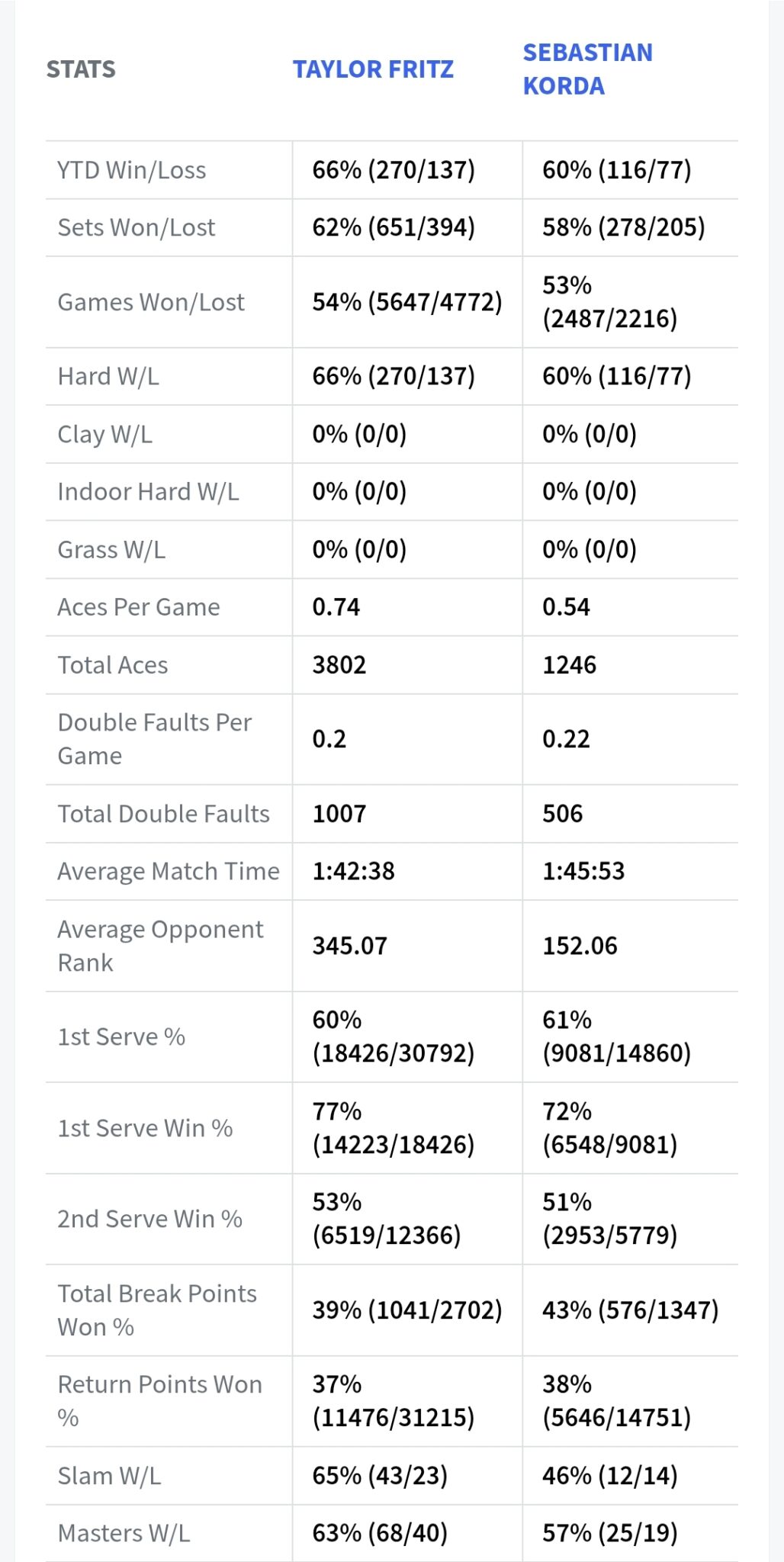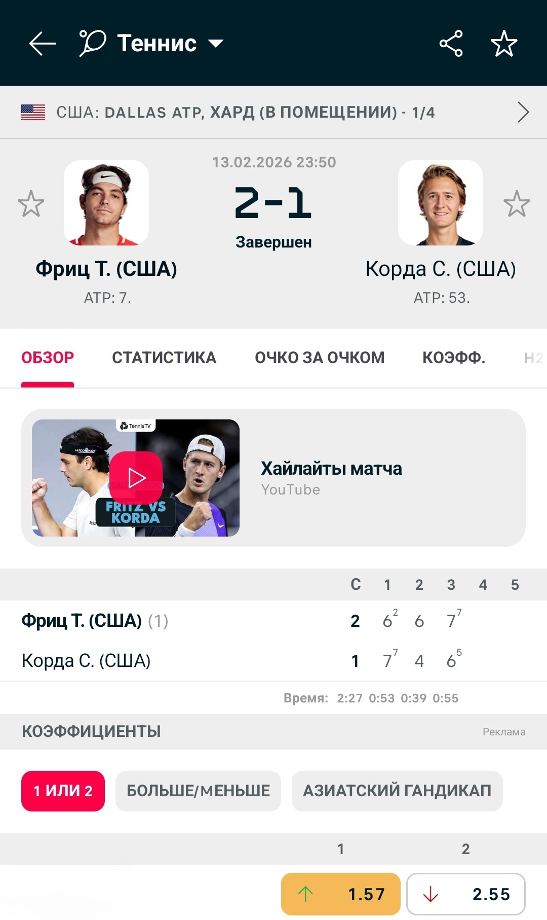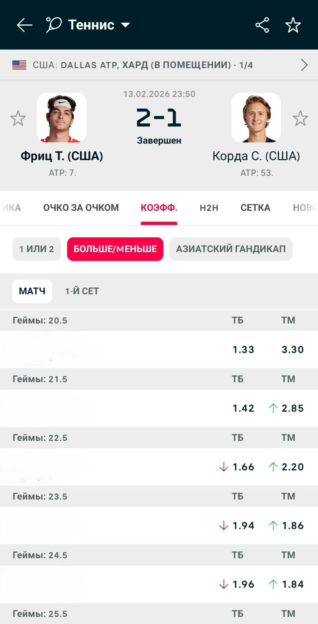 Например, в четвертьфинале турнира в Далласе встречались американцы Тэйлор Фриц и Себастьян Корда. Статистические показатели за карьеру у них вполне подходят: 60 и 61 процент попадания первой подачей, 77 и 72 – процент выигрыша соответственно. На харде теннисисты встречались один раз и сыграли три сета, включая один с тай-брейком.