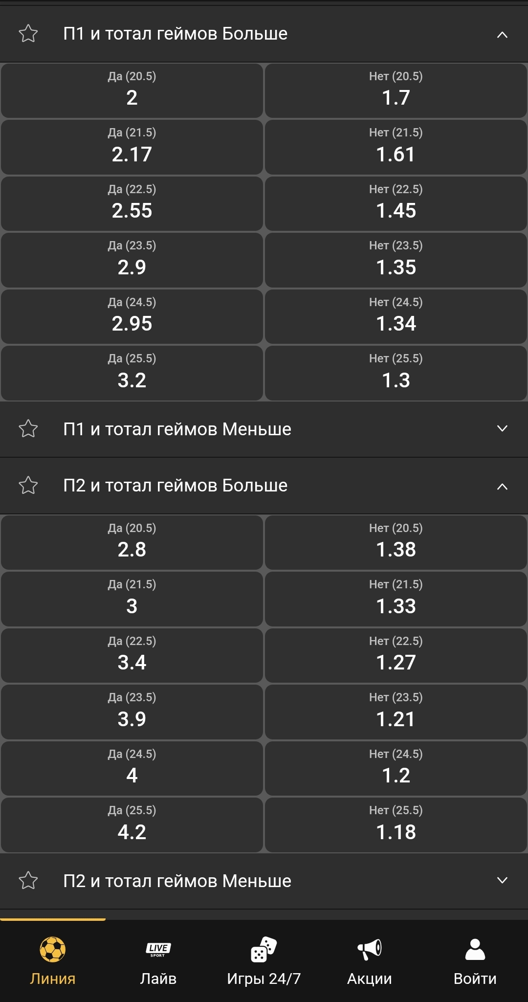 - 23 и больше геймов принесут выигрыш по ТБ и минус по ТМ;