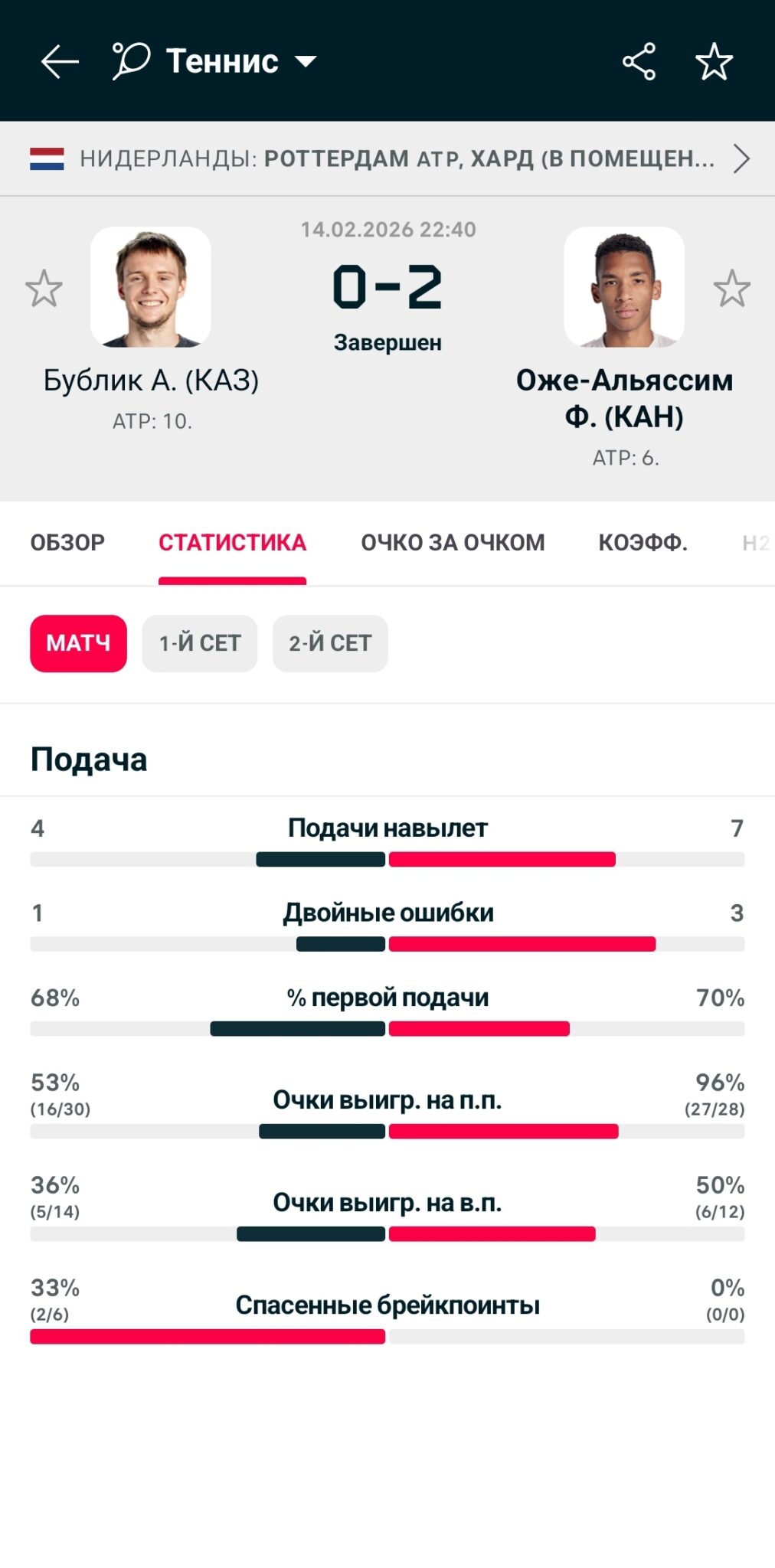 Например, в полуфинальном матче турнира в Роттердаме встречаются Александр Бублик и Феликс Оже-Альяссим. Согласно статистике, теннисисты подают 10 и 9 эйсов в среднем за матч соответственно. При этом букмекер предлагает равные котировки на тотал 21,5. Логично предположить ошибку конторы и заиграть ТМ 21,5 за 1,85.