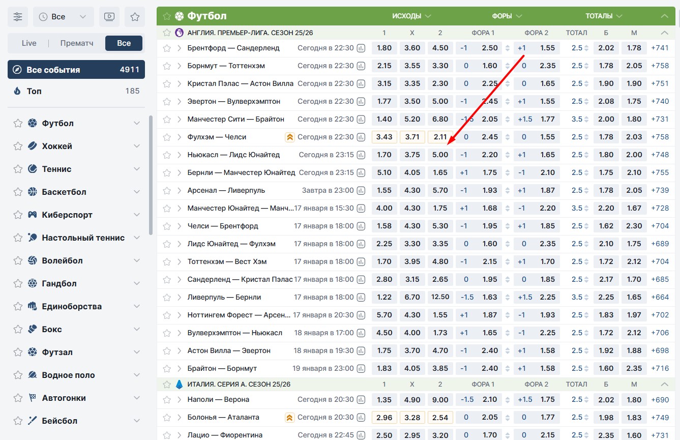Чтобы находить высокие коэффициенты, необязательно проводить тщательный анализ. Можно зайти на сайт любого букмекера и выбрать спортивные игры, в которых есть очевидный фаворит и аутсайдер. Затем нужно посмотреть, какую котировку предоставляют на фаворита с форой -4 или -5.