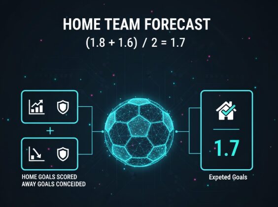 - Прогноз для хозяев. Нужно сложить среднее число голов, забитых хозяевами на своем поле, и средний показатель пропущенных мячей гостей в выездных турах. Полученную сумму необходимо разделить на два.
