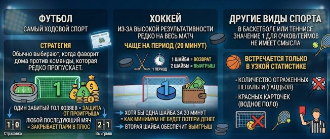 - Футбол – самый ходовой спорт. Обычно такую ставку выбирают, когда фаворит играет дома против команды, которая редко пропускает мячи. Один забитый гол хозяев полностью защищает деньги от проигрыша, а любой последующий мяч закрывает пари в плюс.