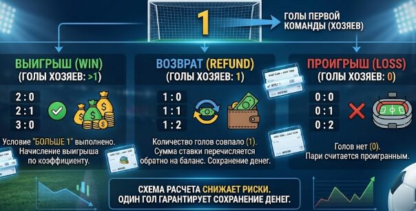 Окончательный расчет по этой футбольной ставке и итоговый коэффициент зависят только от того, превысит ли счет первой команды пороговое значение в один мяч.