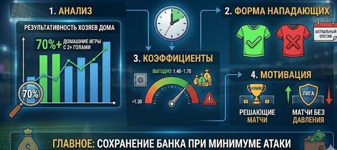 - Глубокий статистический анализ. Перед тем как выбрать событие, необходимо изучить среднюю результативность хозяев в домашних матчах. Если команда стабильно забивает два мяча и более в 70% встреч, этот маркет становится оправданным.