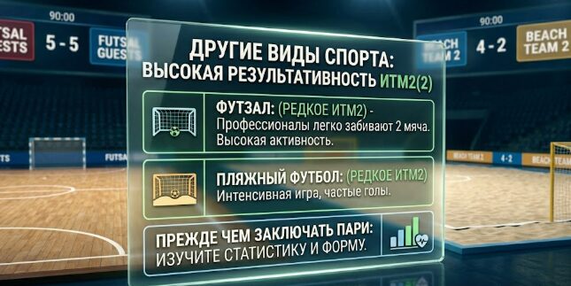 В дисциплинах вроде футзала или пляжного футбола такой спорт подразумевает гораздо большую активность у ворот. Там ИТМ2 встречается редко, так как забить пару мячей для профессионалов не составляет труда. В любом случае, прежде чем заключать пари, стоит изучить статистику очных встреч и текущую форму нападающих.