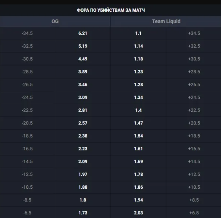Фора +7.5 на аутсайдера выигрывает, если он убил соперников не более чем на 7 меньше. Даже при поражении в матче ставка может зайти, если разница в убийствах укладывается в фору.