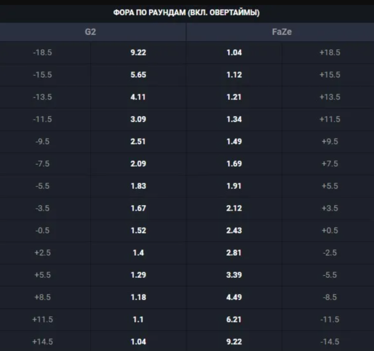 В играх с большим количеством фрагов (Call of Duty) форы могут достигать значений -15.5 или +20.5. В тактических шутерах вроде CS2 форы скромнее. Обычно в диапазоне от -3.5 до +7.5, потому что за карту команды убивают друг друга в среднем 25-30 раз.