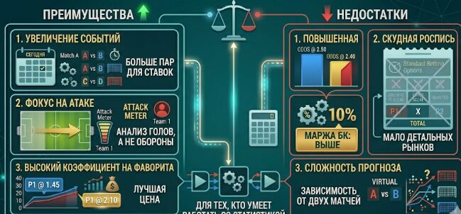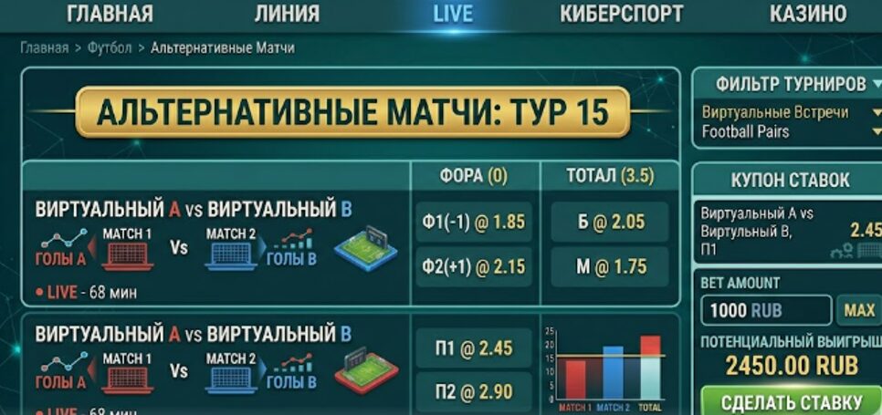 Порой альтернативный формат дает более интересные условия, чем привычная линия. Букмекеры не всегда точно просчитывают результативность в виртуальных парах, поэтому здесь реально поймать завышенный коэффициент.
